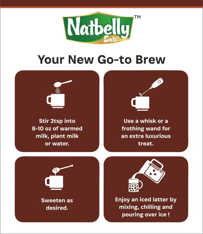 DIRECTIONS TO USE: HOT MORINGA CHOCO LATTE : Take 8-10 oz cup of luke warm malik/coconut milk/vegan milk. Add 1 or 2 Tbsp of Moringa Choco Latte and use a whisk or a frothing wand for an extra luxurious treat, serve and enjoy nutrient rich delicious Moringa Choco Latte.